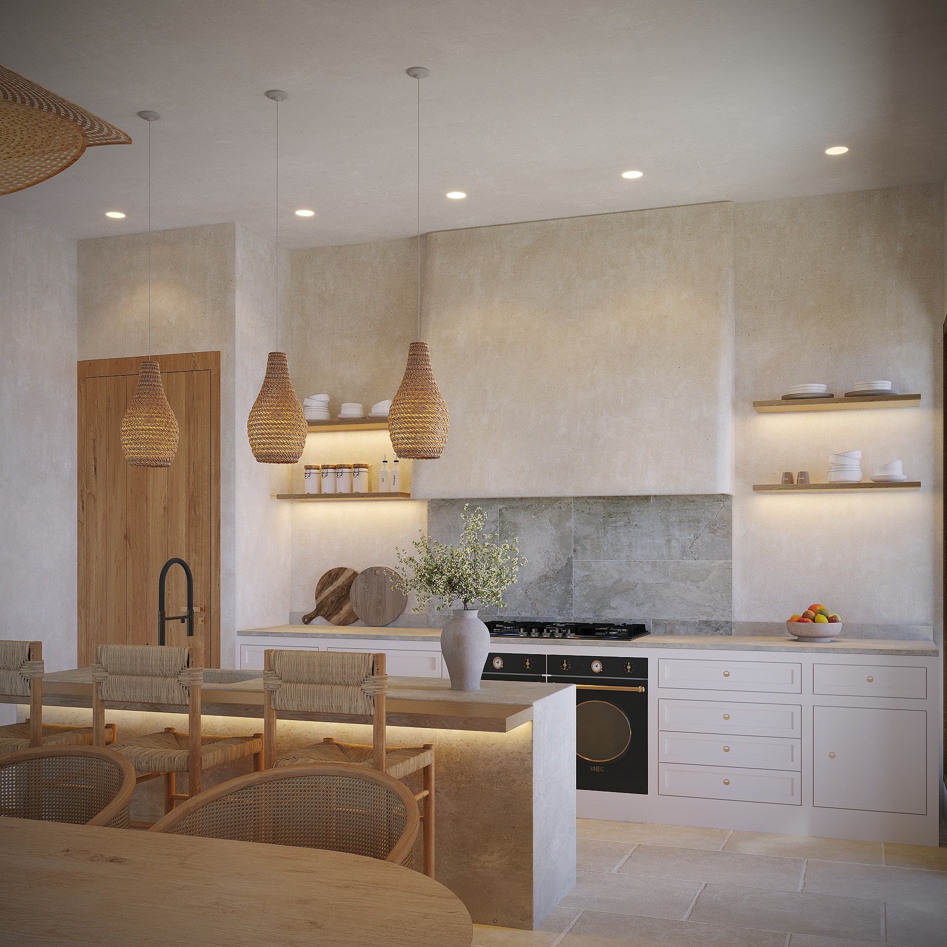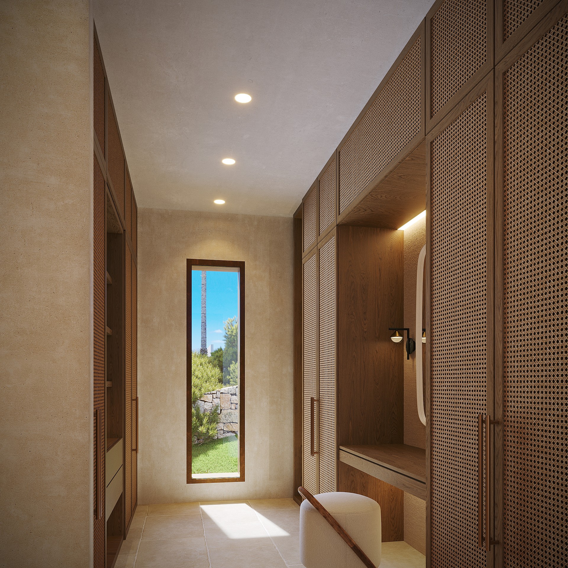 Casa Hemingway est une villa méditerranéenne exclusive à Jávea, caractérisée par ses angles arrondis et sa façade vert olive. L'intérieur allie luxe et confort, avec des sols en microciment, des salles de bains modernes et des finitions haut de gamme.
