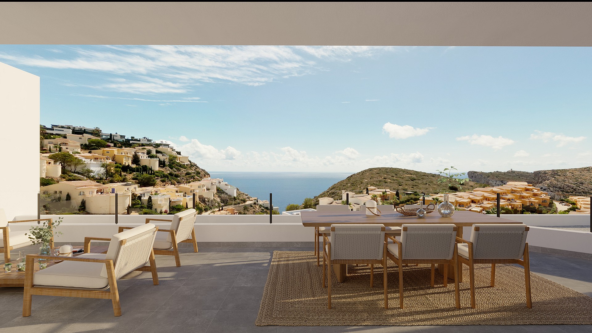 Montecala Gardens - Duplex livré avec 2 Chambres et 2 Salles de bains, commun piscine et place de parking dans le domaine, situé à Benitachell - Cumbre del Sol à la Costa Blanca nord en Espagne.