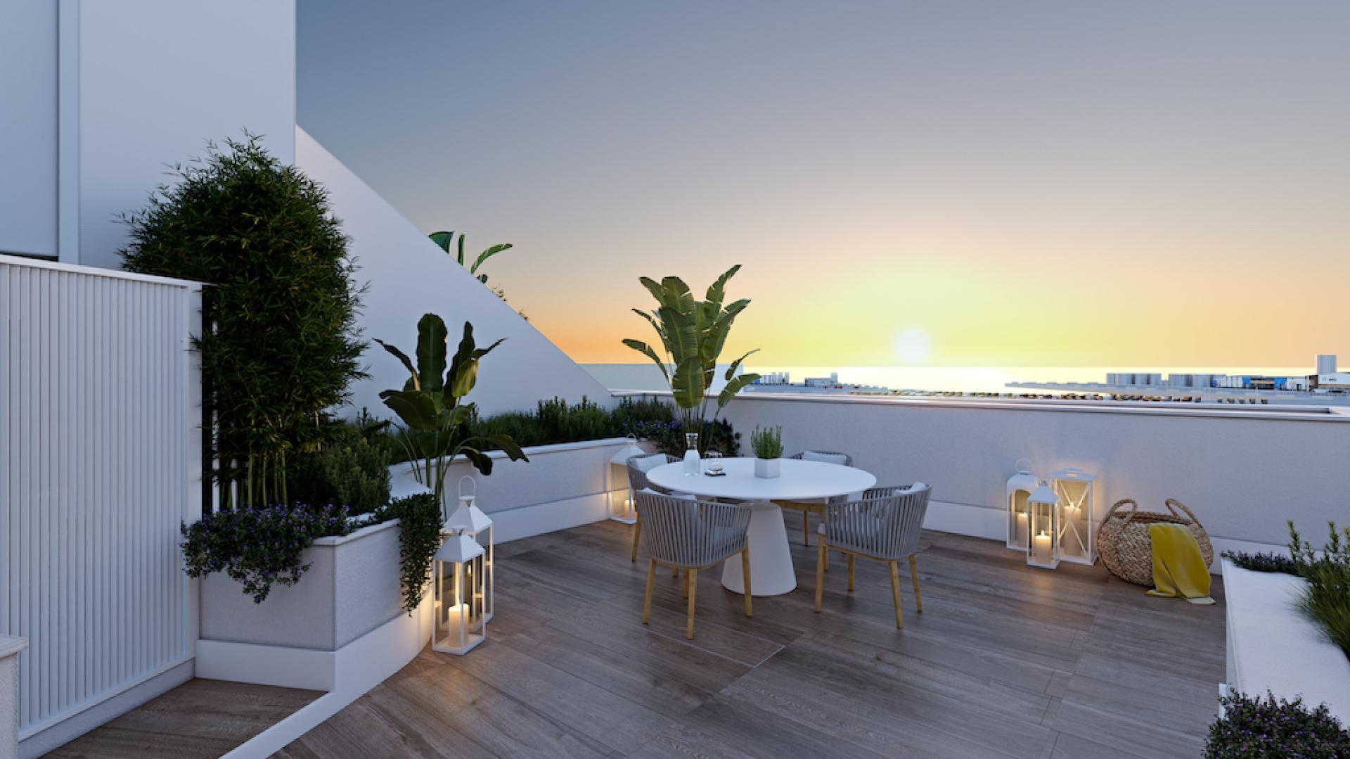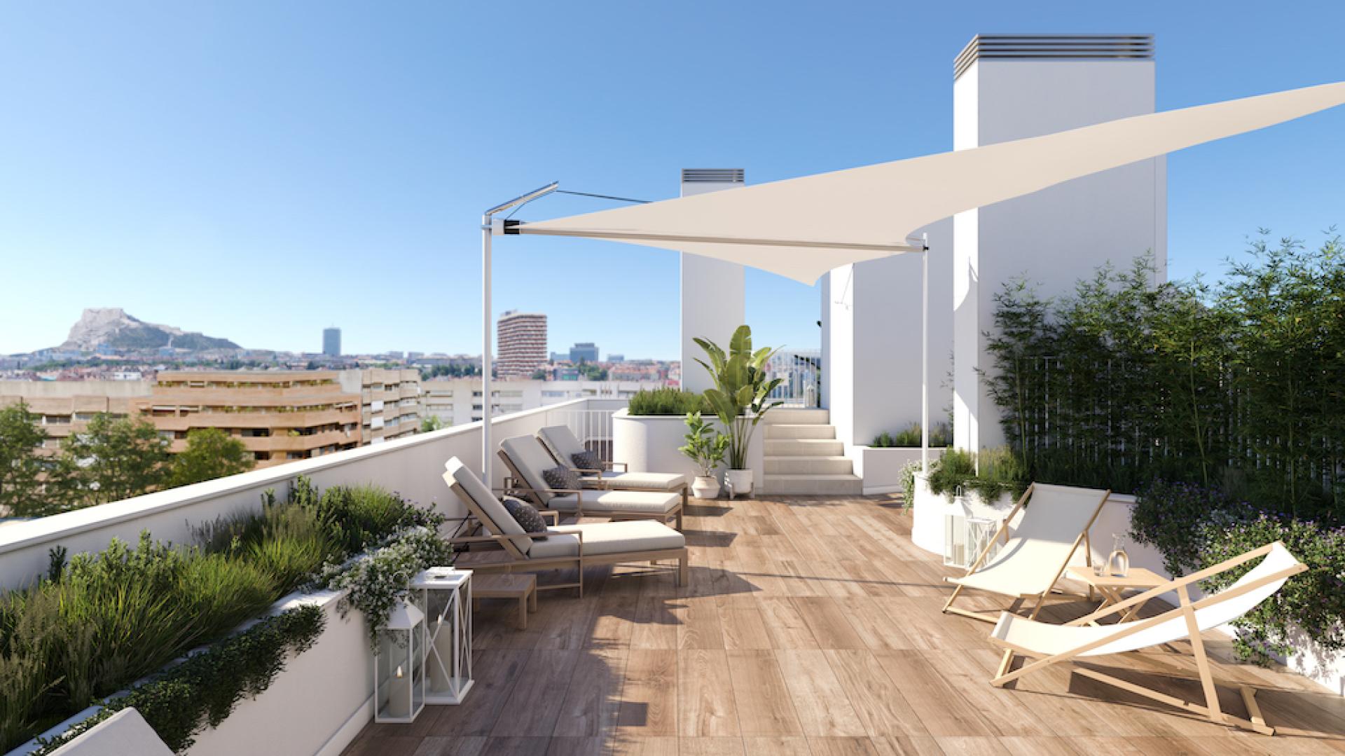 - Appartement - terrasse livré avec 3 Chambres et 2 Salles de bains, commun piscine et parking souterrain et débarras en option, situé à Alicante à la Costa Blanca sud en Espagne.