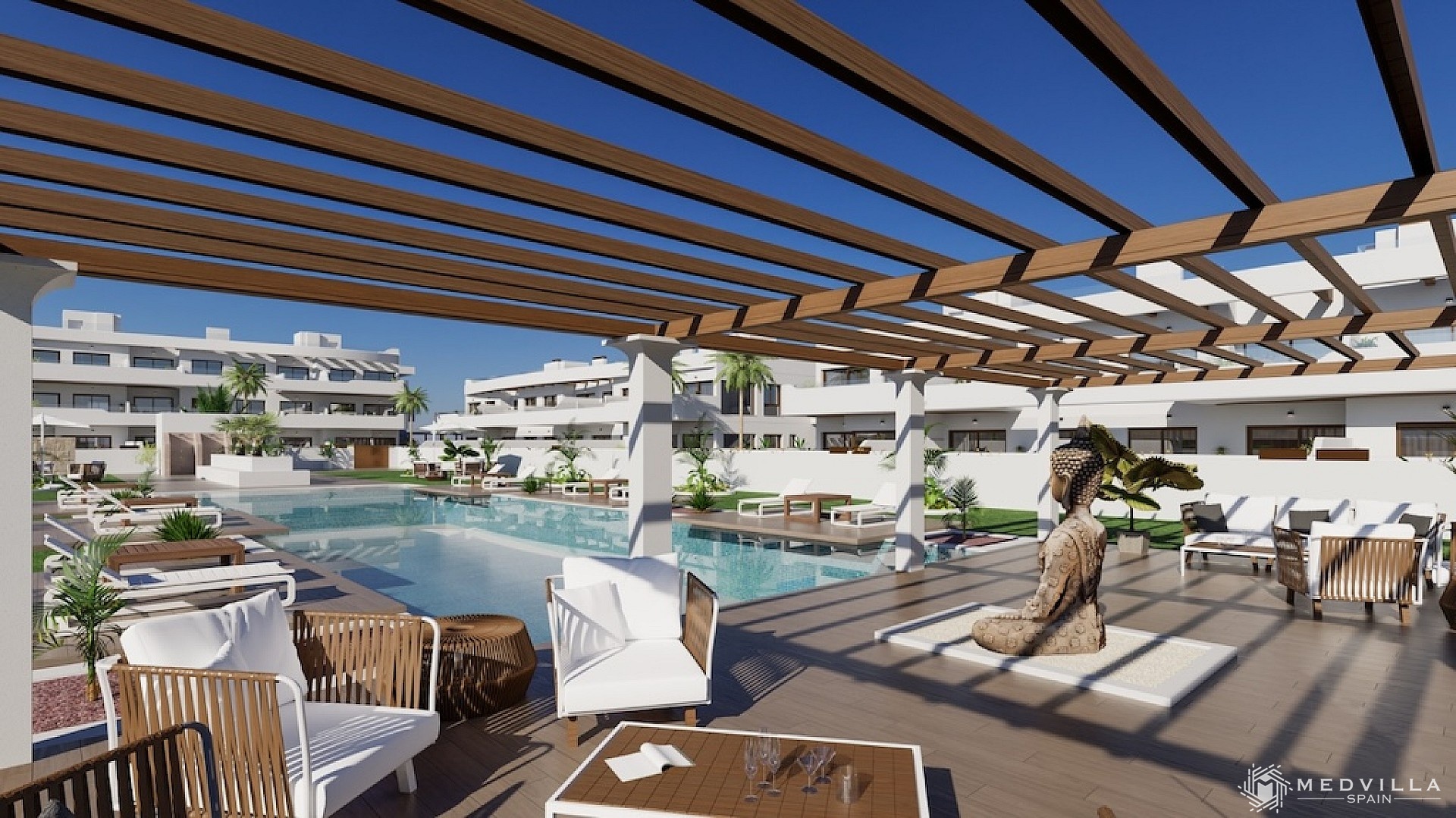 La Sunrise F3 - Appartements - terrasse sur le toit livré avec 2 Chambres et 2 Salles de bains, commun piscine et place de parking sur son propre terrain, situé à Los Alcazares à la Costa Cálida (Murcia) en Espagne.