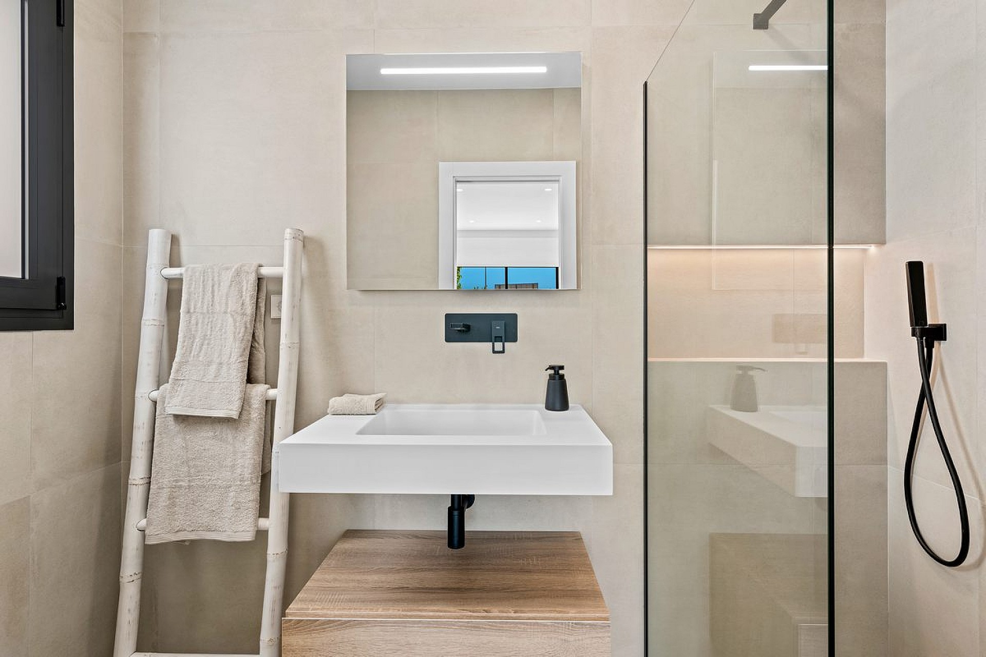 Le prix comprend les extras suivants en standard : salle(s) de bains finie(s), porte de sécurité, radiateur sèche-serviettes, volets électriques dans les chambres, piscine privée, etc…