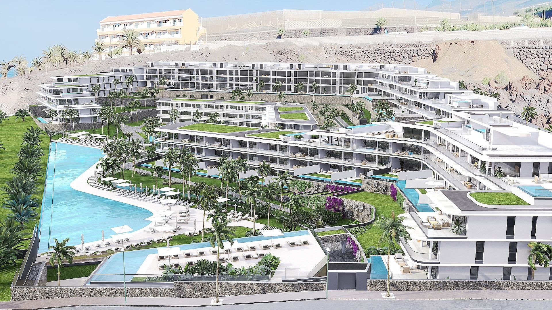 Solum - Appartement - jardin livré avec 2 Chambres et 2 Salles de bains, commun piscine et place de parking souterrain et débarras, situé à Guia De Isora à la Ténérife Sud en Espagne.