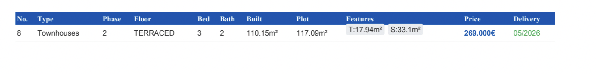 | Villa | 3 | 2 | 107,09 m² | 18,01 m² | 34,29 m² | 107,08 m² | 269,000€ | Plus d'infos... |