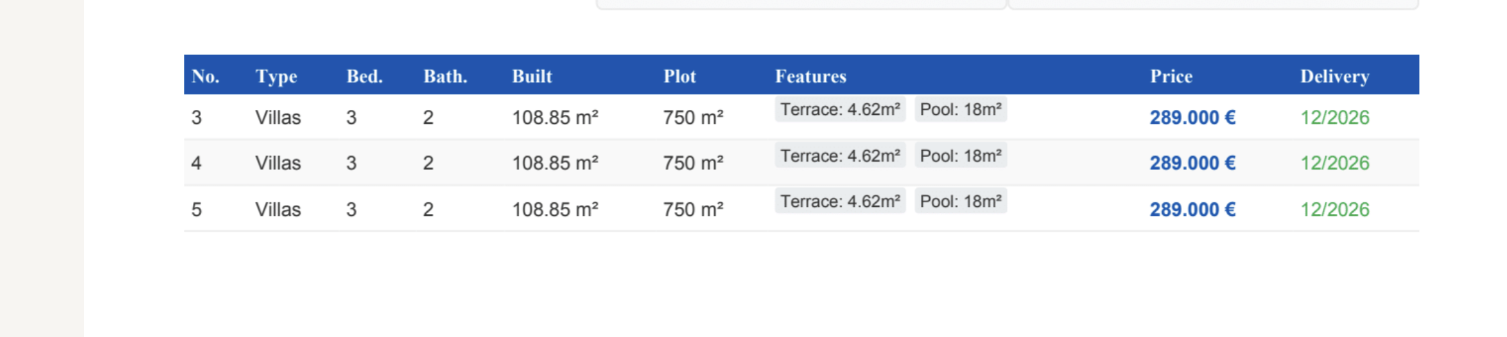 Villa | 3 | 2 | 108,85 m² | 4,62 m² | 750 m² | 289,000€ | Plus d'infos... |