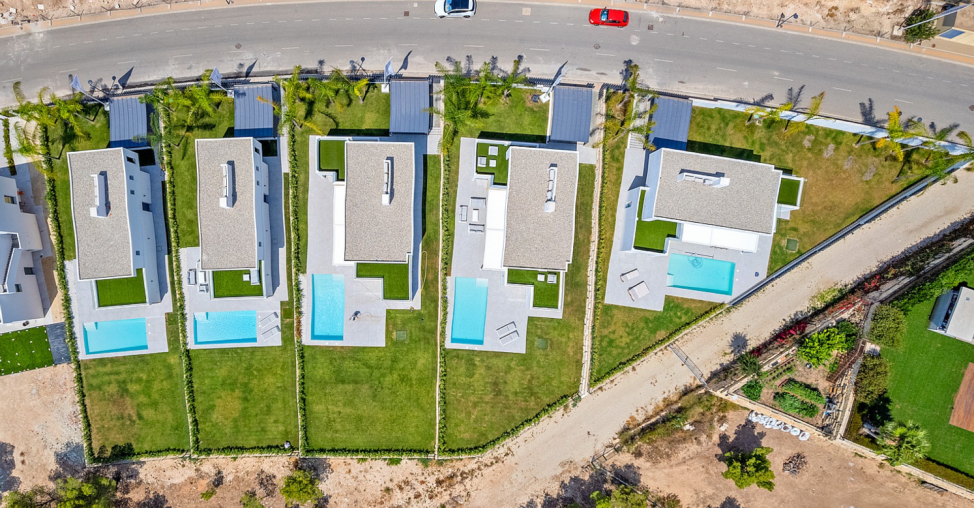 - Espace extérieur privé : Chaque parcelle, d’une superficie comprise entre 590 et 700 m², dispose d’un grand jardin et d’une piscine privée – parfaits pour se détendre et profiter du climat méditerranéen.