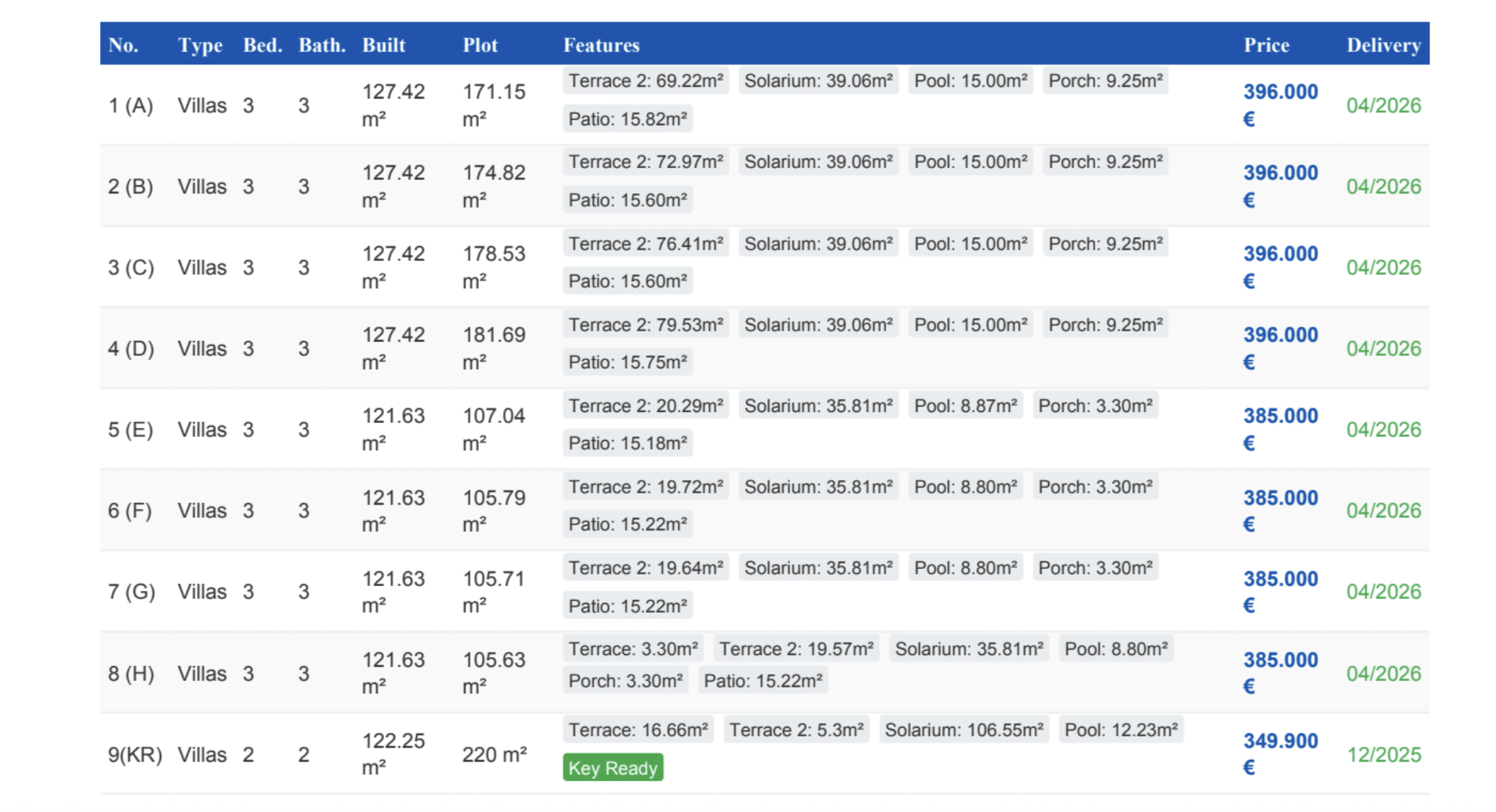 Maisons neuves durables avec 8 maisons mitoyennes. Chaque maison dispose de 3 chambres, 3 salles de bains, une piscine privée, un solarium avec cuisine d'été et un parking sur place.