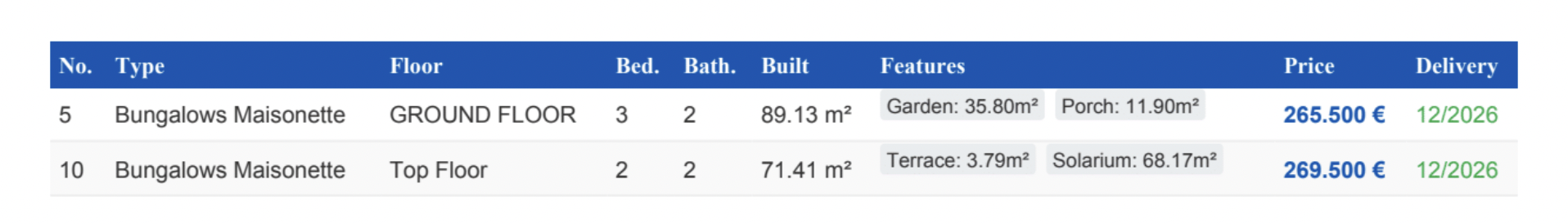 | Modèle | Chambres | Salles de bains | Surface habitable | Terrasses | Surface solarium | Surface jardin | Prix min | |