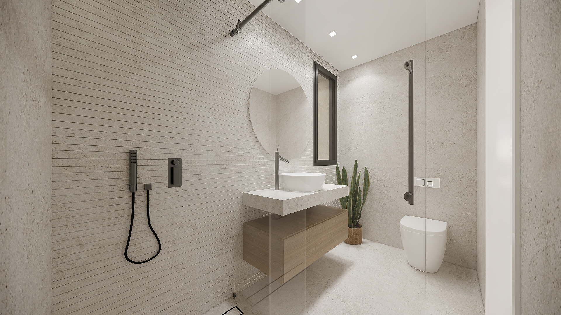 Le rez-de-chaussée comprend un espace de vie ouvert avec cuisine intégrée et îlot central, créant une ambiance lumineuse et conviviale. De larges baies vitrées coulissantes relient le séjour au jardin, à la piscine et au parking privé. Ce niveau offre également une chambre avec salle de bains et dressing, des toilettes invités et une buanderie.