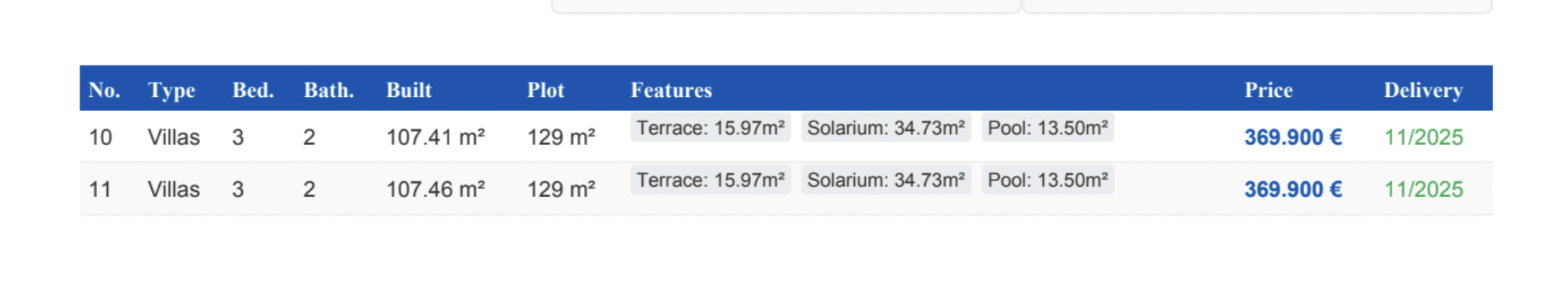 | Villa | 3 | 2 | 107 m² | 35 m² | 129 m² | 369,900€ | Plus d'infos... |