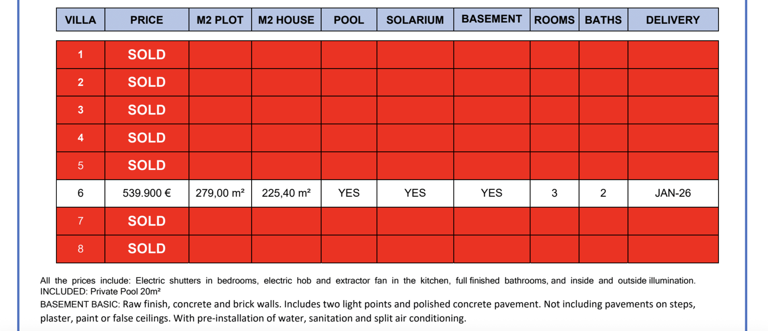 De plus, toutes les villas disposent de salles de bains entièrement finies, de volets électriques, d'éclairage intérieur et extérieur et de placards.