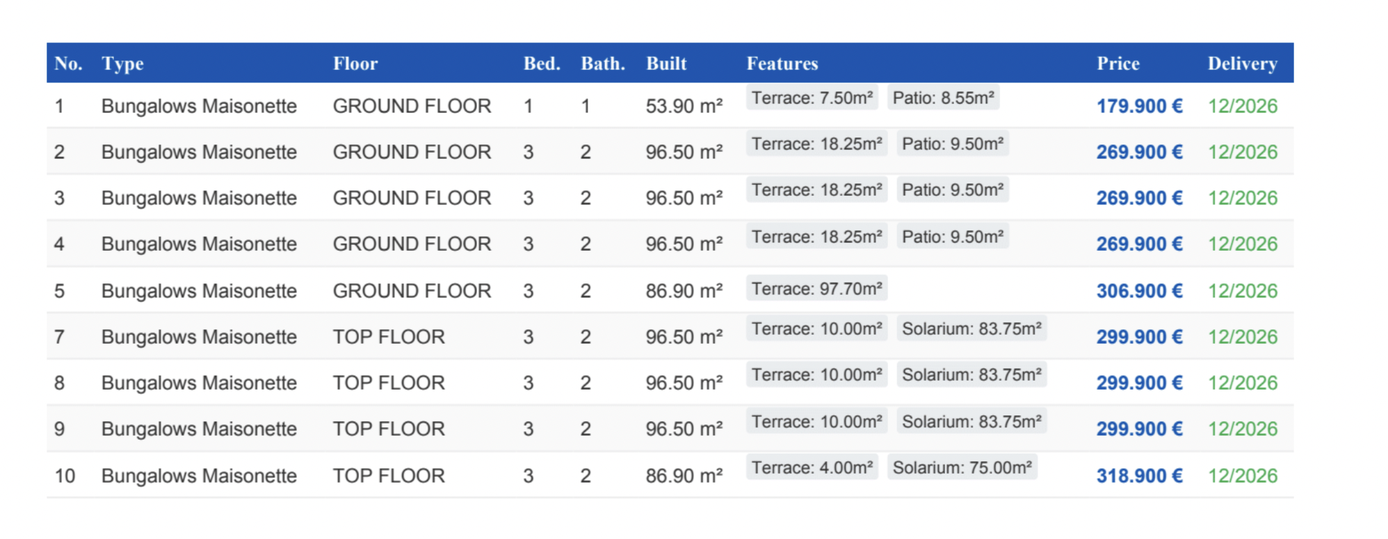 Le projet comprend 10 bungalows neufs, avec un choix d'appartements d'une chambre et d'une salle de bain, parfaits pour une première maison ou une maison de vacances, ainsi que des appartements de trois chambres et deux salles de bain, parfaits pour les familles ou ceux qui recherchent un espace supplémentaire.